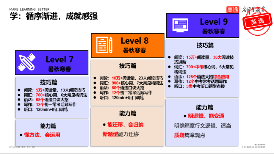 为了让全国学生真正了解英语考试目标,高途多位资深英语老师研发出一套【英语单词学习训练营】,帮助孩子养成英语学习思维,打好基础关。