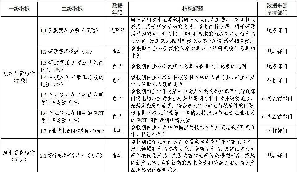 创新积分核心指标共涵盖3类一级指标18个二级指标(见附1)。第一类是技术创新指标。该类指标衡量企业在创新研发方面的投入以及最终创新结果,具体包括研发费用金额、研发费用增速、研发费用占营业收入的比例、科技人员占职工总数的比重、与主营业务相关的发明专利申请量、与主营业务相关的PCT专利申请量、企业技术合同成交额等7个指标。第二类是成长经营指标。该类指标衡量企业长期可持续的成长经营能力,具体包括高新技术产品收入、营业收入、营业收入增长率、研究生以上人员占比、研发费用加计扣除所得税减免额、净资产利润率等6个指标。第三类是辅助指标。该类指标对企业创新能力进行补充评价,具体包括吸纳应届毕业生人数、承担建设省级及以上研发或创新平台数量、获得省级及以上科技奖励数量、承担省级及以上科技计划项目数量、获得风险投资金额等5个指标。