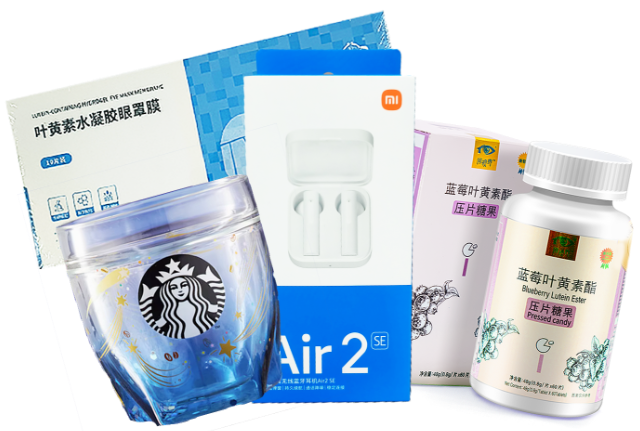 奖品:小米蓝牙耳机、星巴克水杯、蓝莓叶黄素酯压片糖果、叶黄素水凝胶眼罩膜,还有更多奖品...