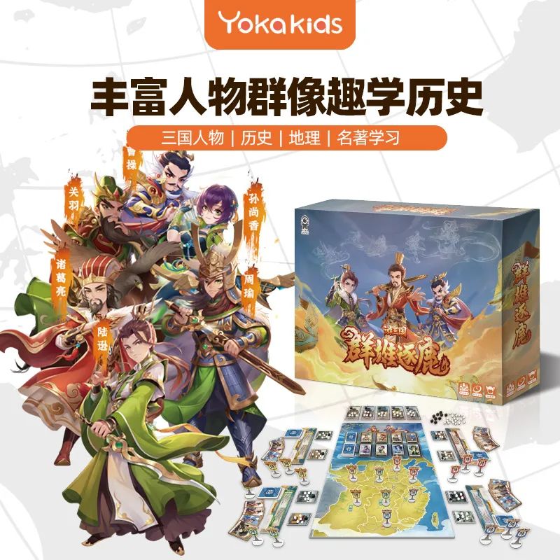 Yokakids:少年英雄三国逐鹿《游三国:群雄逐鹿》的背景设定在东汉末年,玩家将扮演身处三国乱世、志在天下的主公,在游戏中通过招募武将构筑牌组,完成城池的攻防与占领,获得5座城池的一方将获得胜利。该产品包含107张武将卡,13张城池卡,20个军旗,130个兵力标记,以及1块以东汉末年地图为原型的游戏版图,适合2-4人同时游玩体验。