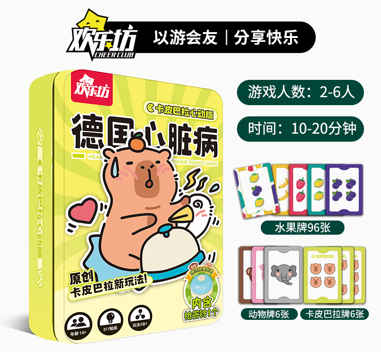 《德国心脏病:卡皮巴拉心动版》:“情绪稳定”的第一名当呆萌的“卡皮巴拉”水豚,遇上经典桌游“德国心脏病”,会碰撞出怎样的火花?《德国心脏病:卡皮巴拉心动版》除了有时尚可爱的外观,更有创新的卡皮巴拉变体规则。产品包含水果牌96张,动物牌6张、卡皮巴拉牌6张,随着动物牌和卡皮巴拉牌的加入,游戏也衍生了三种规则,用一款产品带来“三合一”的精彩游戏体验。让情绪稳定第一名的可爱网红“卡皮巴拉”为家庭游戏、朋友聚会增加更多欢乐吧!