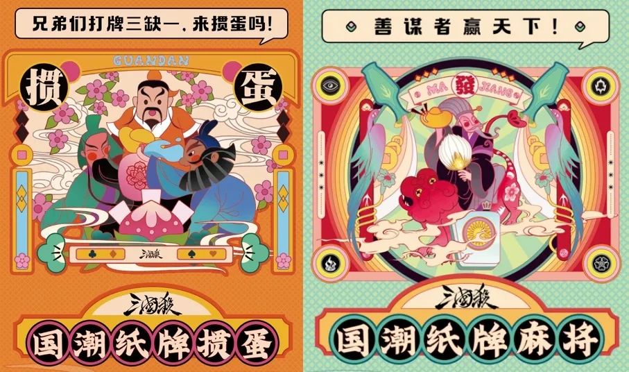 11月,两款全新三国杀国潮纸牌周边面世,多巴胺配色纸牌掼蛋、纸牌麻将,更契合年轻人口味。其中,三国杀国潮纸牌掼蛋在新潮的设计基础上,趣味性地结合了三国杀元素。产品采用让人眼前一亮的国潮美术风格,将三国中“刘关张”、“三张”兄弟等经典“三缺一”组合,分别组成了4组花色。大小王则是象征着地位的官阶玉玺。产品一共包含2副扑克牌、26张记分牌,除了鲜明有趣的牌面之外,还有1张带有桃子、桃花元素设计的专属桌垫。三国杀国潮纸牌麻将则将魏、蜀、吴、群四方势力的大谋士的代表元素,融入了东南西北风的牌面中。而传统麻将中的条、饼、万,还分别融入了谋士需要习得星宿、器械、兵法等元素。玩家手握这副纸牌麻将,即可在牌桌上化身谋士、大杀四方。