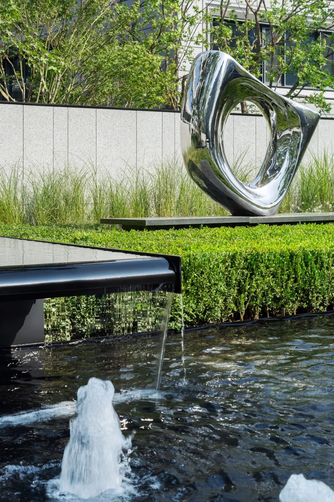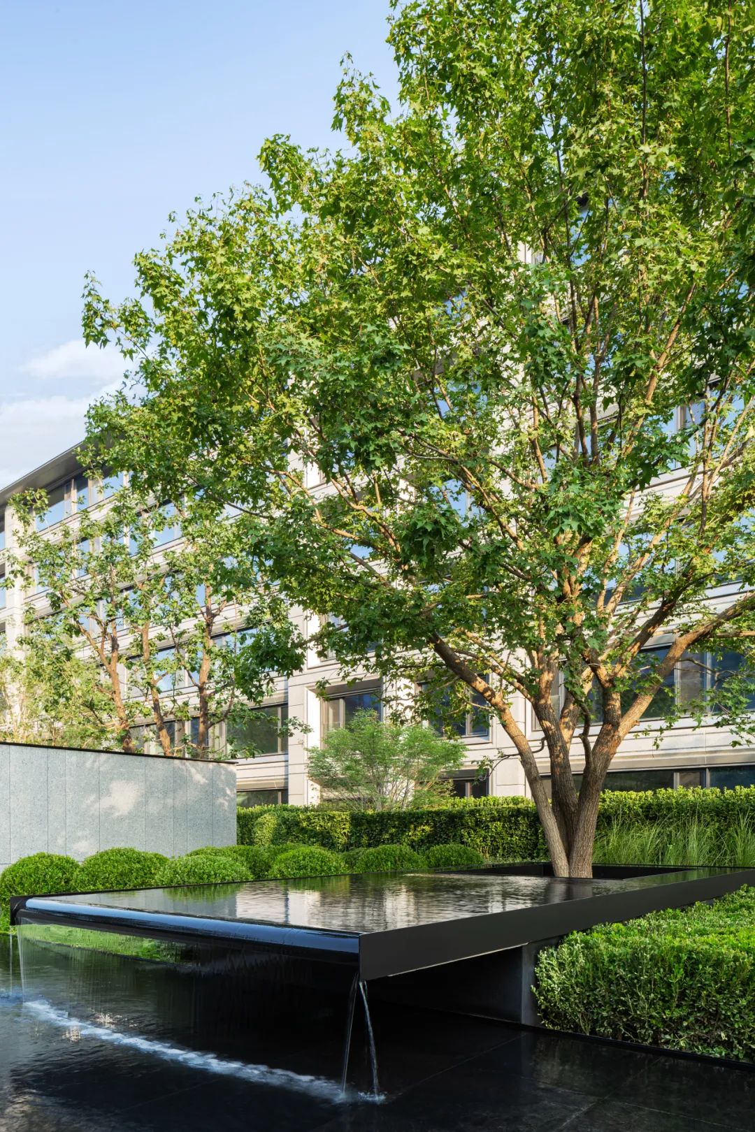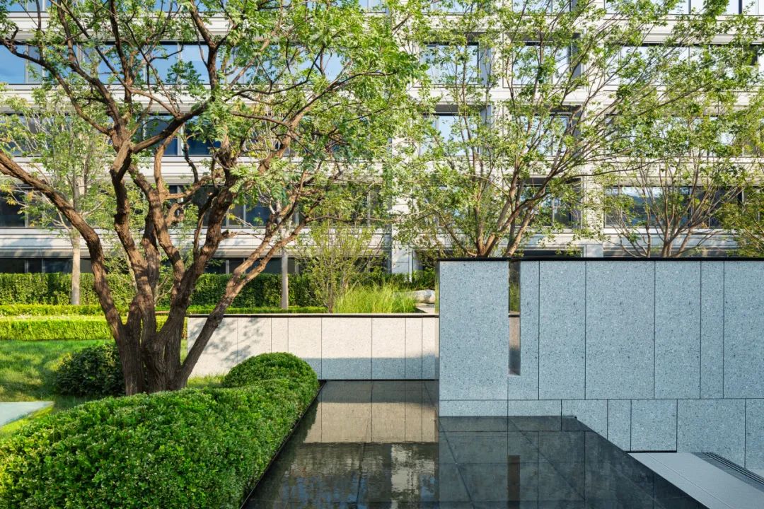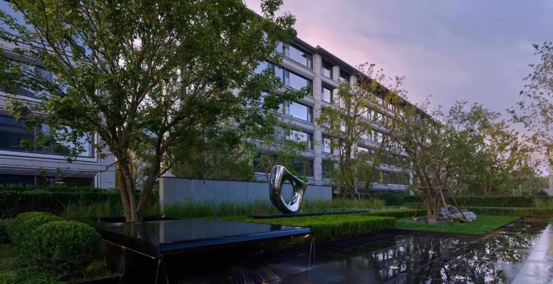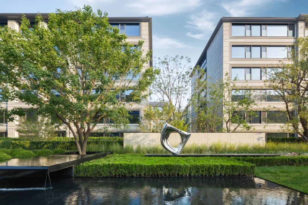 宅间精心布置了雅致的休憩平台与中央花园大气的疏林草地景观互相掩映,镜面水景倒映摇曳的光影,给人进则静谧,出则舒朗的感受。园内自然分布着各类绿植组团,既有元宝枫、鸡爪槭、海棠、白皮松等极具观赏性的树种,更有树中“活化石”之称的银杏、水杉栽种其中,艺术雕塑的点缀,又增强了文化内核和意境营造。项目还利用专项设计,以下凹绿地打造雨水花园,数十种四季分明、层次丰富的户外植物,形成自然滋养与循环生态。全龄需求的休闲活动场地采用生态环保地垫材料,将图案做了艺术化抽象处理。