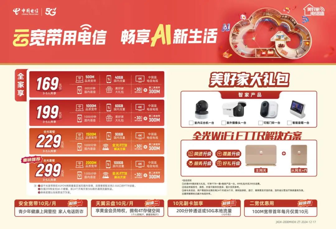 100GB国内流量+2000M品质宽带+1500分钟国内语音+中国蓝电信电视+全光FTTR解决方案