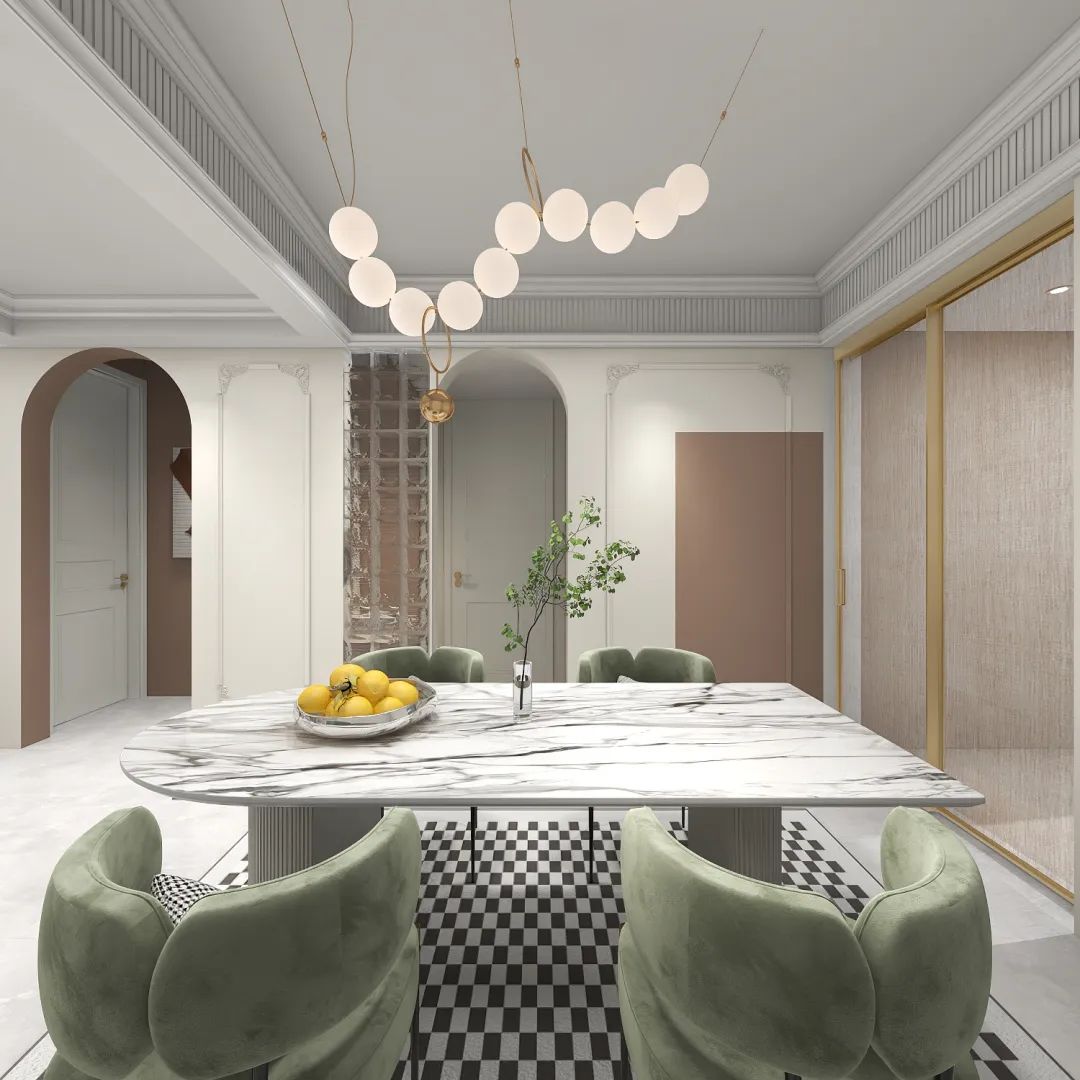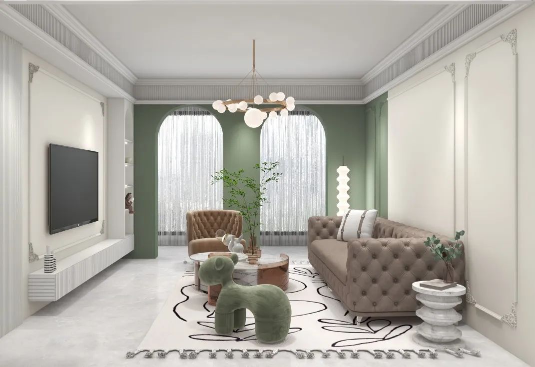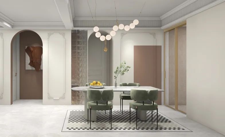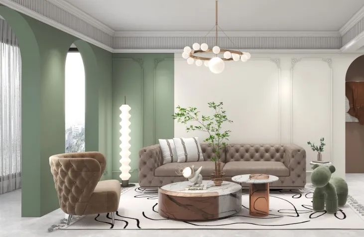 深绿色拱形隔断和仿生沙发椅,与空间形成跳色