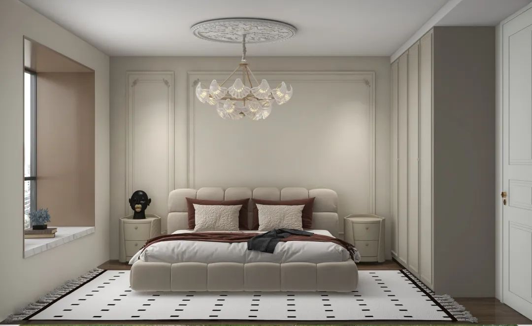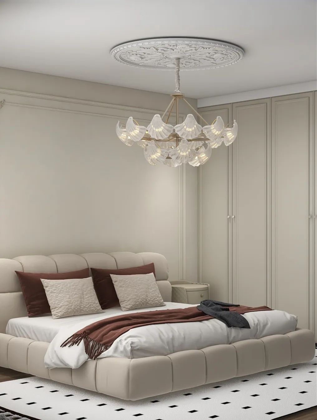 奶油灰衣柜、贝壳吊灯、床头柜艺术品