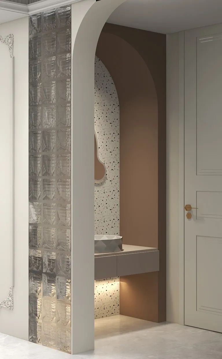 高进深橙棕色拱形门框,构建出宽敞盥洗台区域