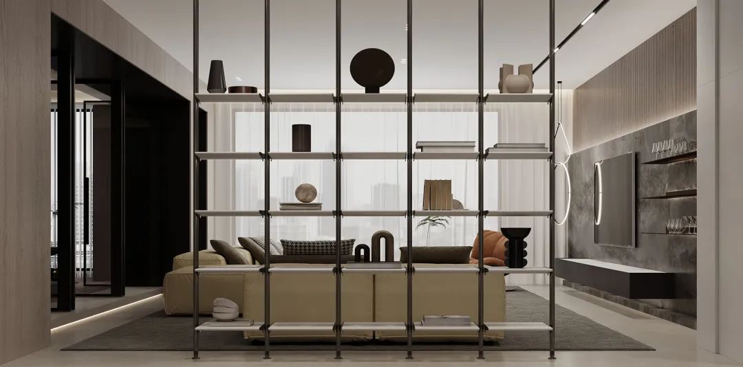 现在大家都喜欢客餐厅一体式设计,如果客厅和餐厅之间的间隔区域过于宽大,不妨在中间放置一个隔断柜,可以是书柜,也可以是个人收藏展示柜,这样既美观,也解决了收纳空间的问题。