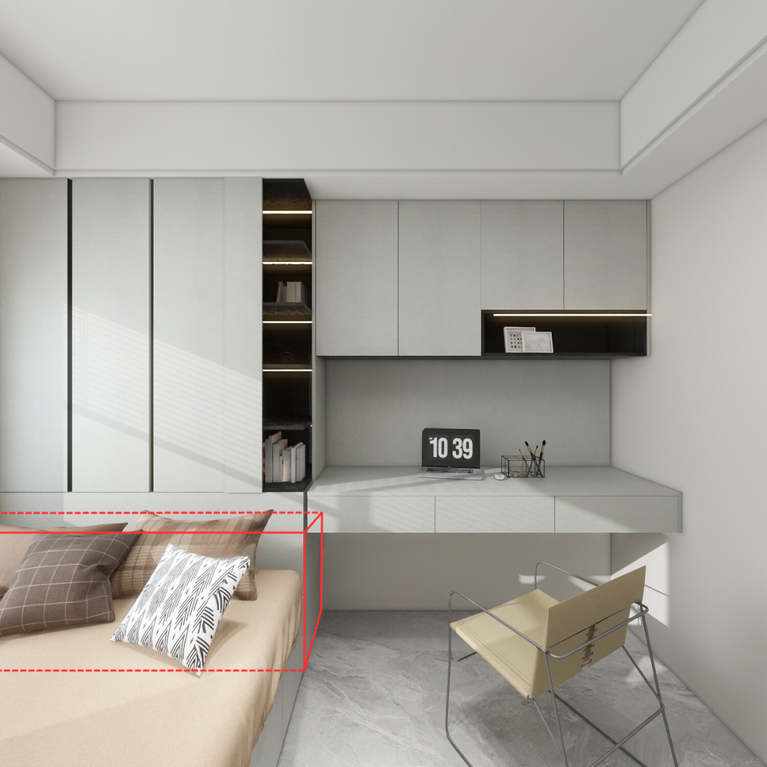 我们可以在这块区域,配合书桌的空间,设置一个滑轨柜体,这块区域可以进行抽拉,存放箱包或者其他物品。