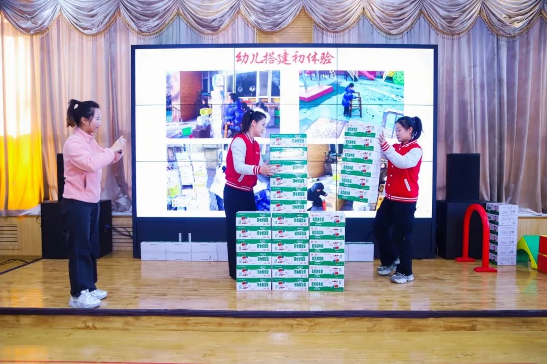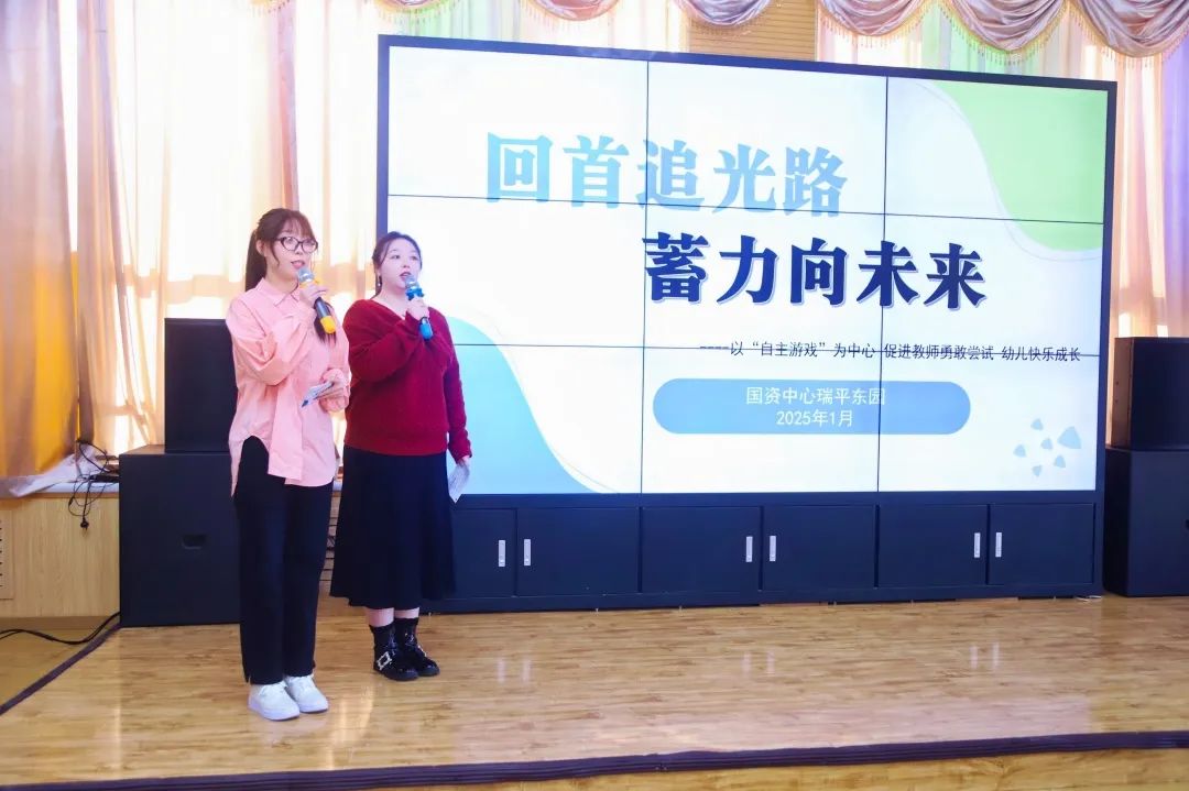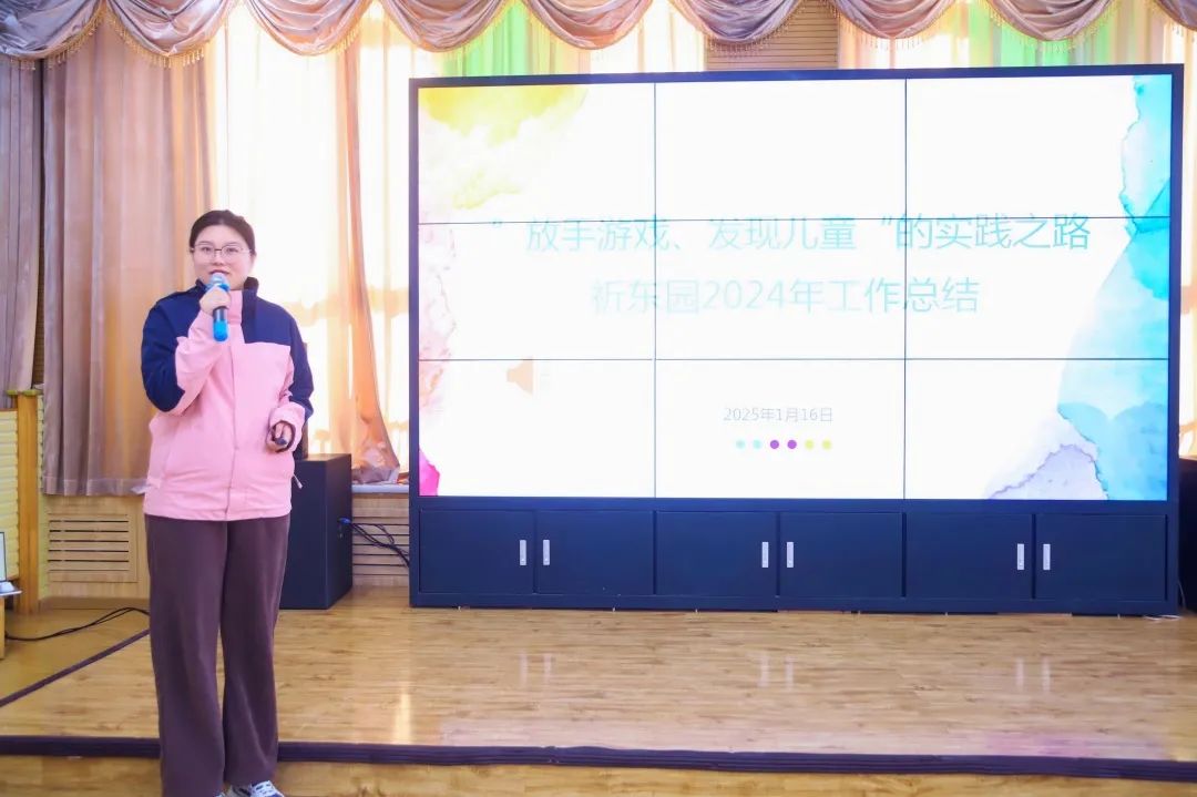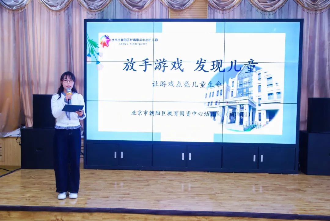 国资中心幼儿园(东风苑园)执行园长马宏波、副园长邓蓓蓓、教科研主任崔峥、后勤主任李莹和教师杨希、侯悦、郭培、刘静辉通过播放微视频“2024 溯源与成就”和诗朗诵《相信相信的力量》,带领大家回顾了园所这一年开展自主游戏历程。2024年,东风苑园围绕“源基文化”,探索幼儿自主游戏与学习的结合,推动内涵式发展。溯儿童游戏动力之源——以“马赛克观察法”发现孩子兴趣与需求,优化园所环境,满足探索与创造需求;溯教育智慧之源——融入教育戏剧策略,通过观察与回溯,支持孩子有意义学习,解决游戏中的教育问题;溯教师成长之源——教研团队在实践中突破局限,提升游戏水平,转化理念为行动。