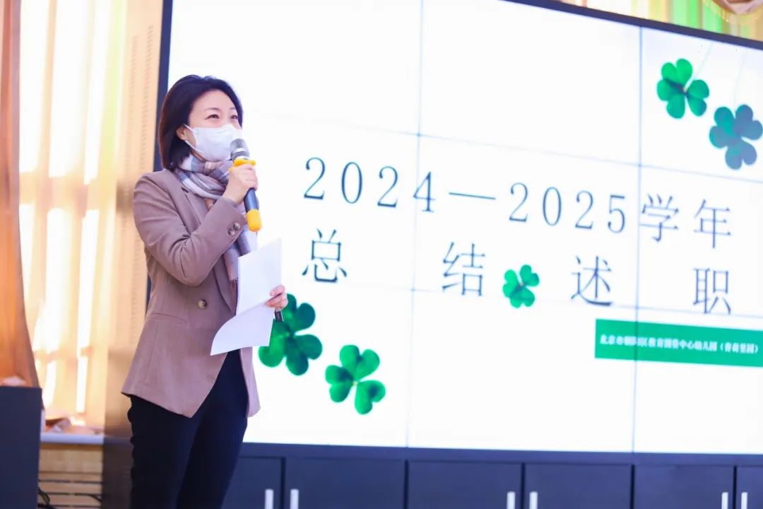 国资中心幼儿园总园长张瑞凤围绕“感恩、感动和感慨”三点感受进行了总结。张园长表示感谢领导、专家以及示范园园长、老师们对国资中心幼儿园的鼎力支持与悉心帮助,正是这份力量为国资中心幼儿园注入了强大动力,使幼儿园在短短6年时间迅速发展至24所分园,各具特色又均衡发展。回首过往,各分园执行园长与干部们在工作中始终坚守岗位、迎难而上。无论是在日常教学的精心组织,还是面对应急事件的沉着处理,他们无不展现出极高的责任感与敬业精神。他们的默默付出,是幼儿园一路成长、创造无数精彩瞬间的坚固基石,这份坚守与奉献令人动容。一年时间里,大家在各自岗位上都取得了显著进步。执行园长们在讲述中洋溢着职业自信,中层干部在述职演讲中尽显担当,教师们在游戏故事展示中绽放光彩。自主游戏从最初的迷茫探索,到如今逐步找准方向;食堂自营转型在挑战中稳步推进;和平园的开园更是集团品牌输出的关键一步意义非凡。这些成果,都是国资团队团结一心、拼搏奋进的有力见证。展望未来,张园长满怀信心。她坚信,在领导与专家的引领与指导下,国资中心幼儿园团队必将继续成长,各分园也将凭借高质量的办园特色,吸引更多幼儿和家长,为朝阳区乃至全国学前教育事业贡献更大的力量。最后,张园长寄语全体教职工:秉持“苔花如米小,也学牡丹开”的精神,勇敢前行,在幼教的沃土上绽放属于自己的光彩!