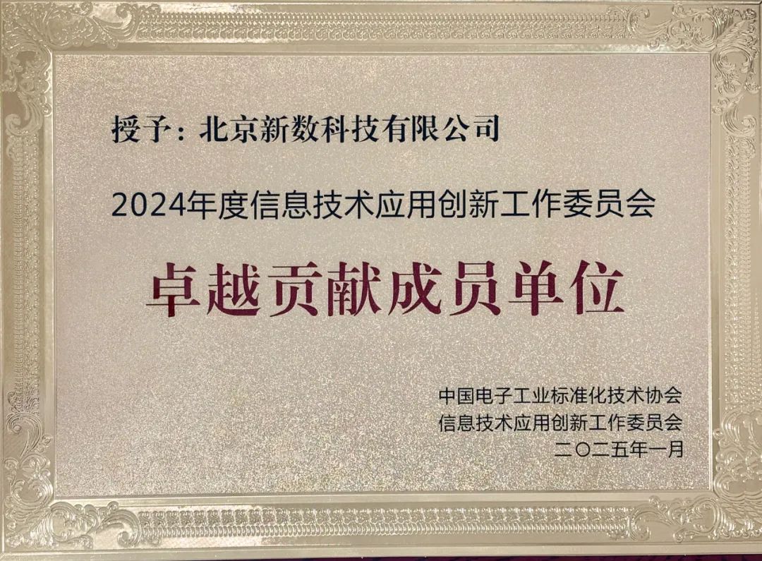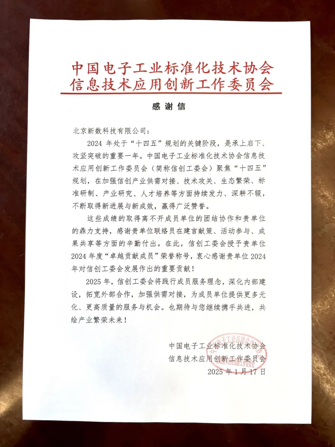 近日,中国电子工业标准化技术协会信息技术应用创新工作委员会(以下简称“信创工委会”)2024年度工作总结座谈会于北京成功召开。本次大会旨在回顾总结2024年信创工作,并对2024年在信创工作中做出突出贡献的成员单位进行表彰。岁月不负耕耘,奋斗必有回响。新数科技凭借在信创工作中的优异表现,被信创工委会授予2024年度“卓越贡献成员单位”的荣誉称号,同时信创工委会向新数科技发来了感谢信,字里行间无不透露着感谢和温暖,新数倍感荣幸和自豪。