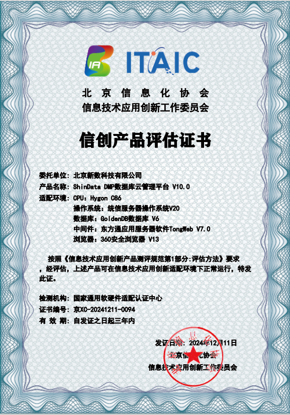 经过产品适配性、产品功能、代码安全性等方面的评估,ShinData DMP数据库云管理平台符合自主可控、安全可信、高效可用的特点,全面兼容芯片、整机、操作系统、中间件、数据库及应用等多领域国产化软硬件,完美契合信创应用迁移适配标准,广泛融入信创生态体系,获北京信创工委会颁发的“信创产品评估证书”。