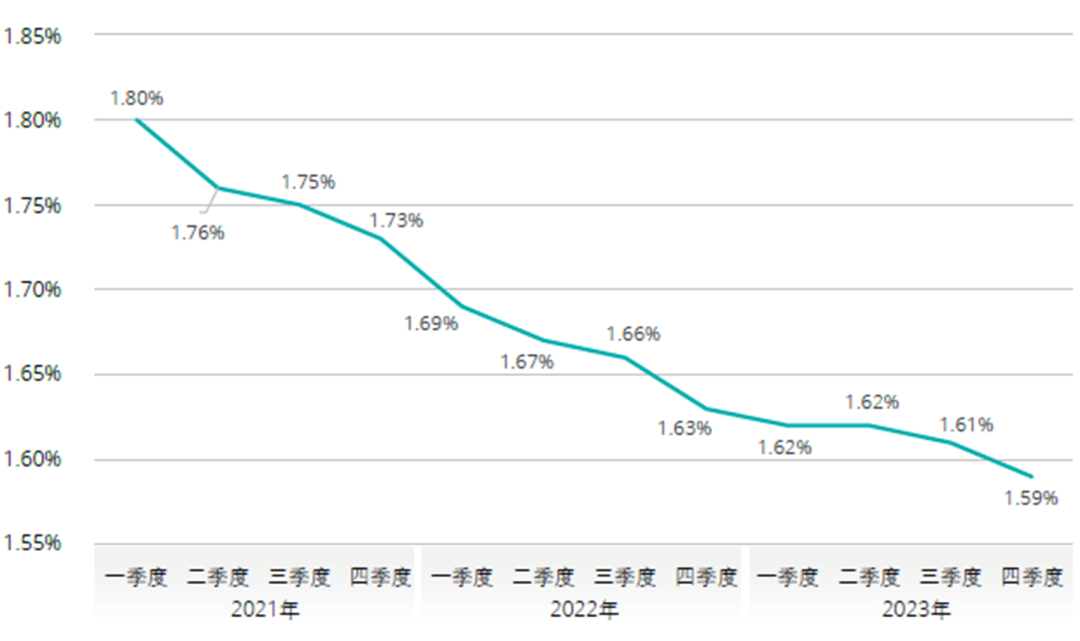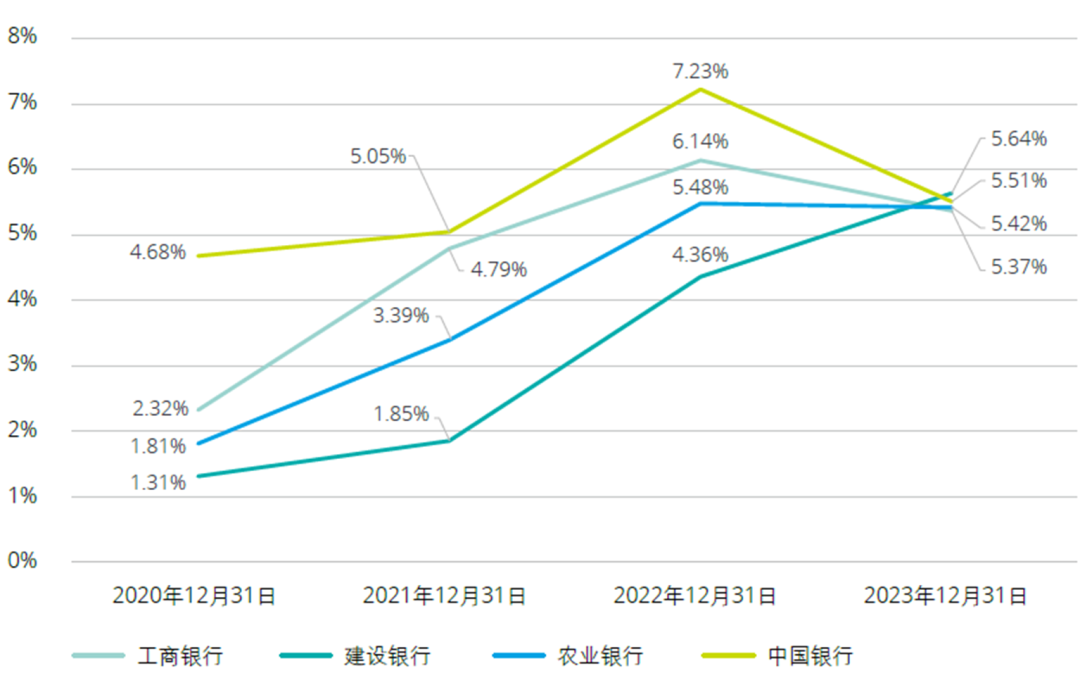 图:全国四大商业银行2020年至2023年房地产行业不良贷款率
