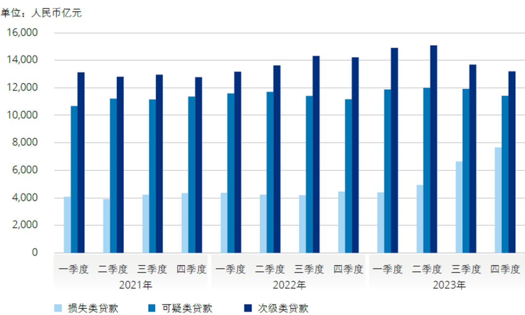 2023年末,不良贷款余额同比增长8.14%,环比增长0.03%,变动幅度较小。但因《商业银行金融资产风险分类办法》的实施,根据五级分类数据来看,2023年末,次级类不良贷款余额同比下降7.19%,环比下降3.58%,而损失类不良贷款余额同比增长72.04%,环比增长15.15%,变动明显。