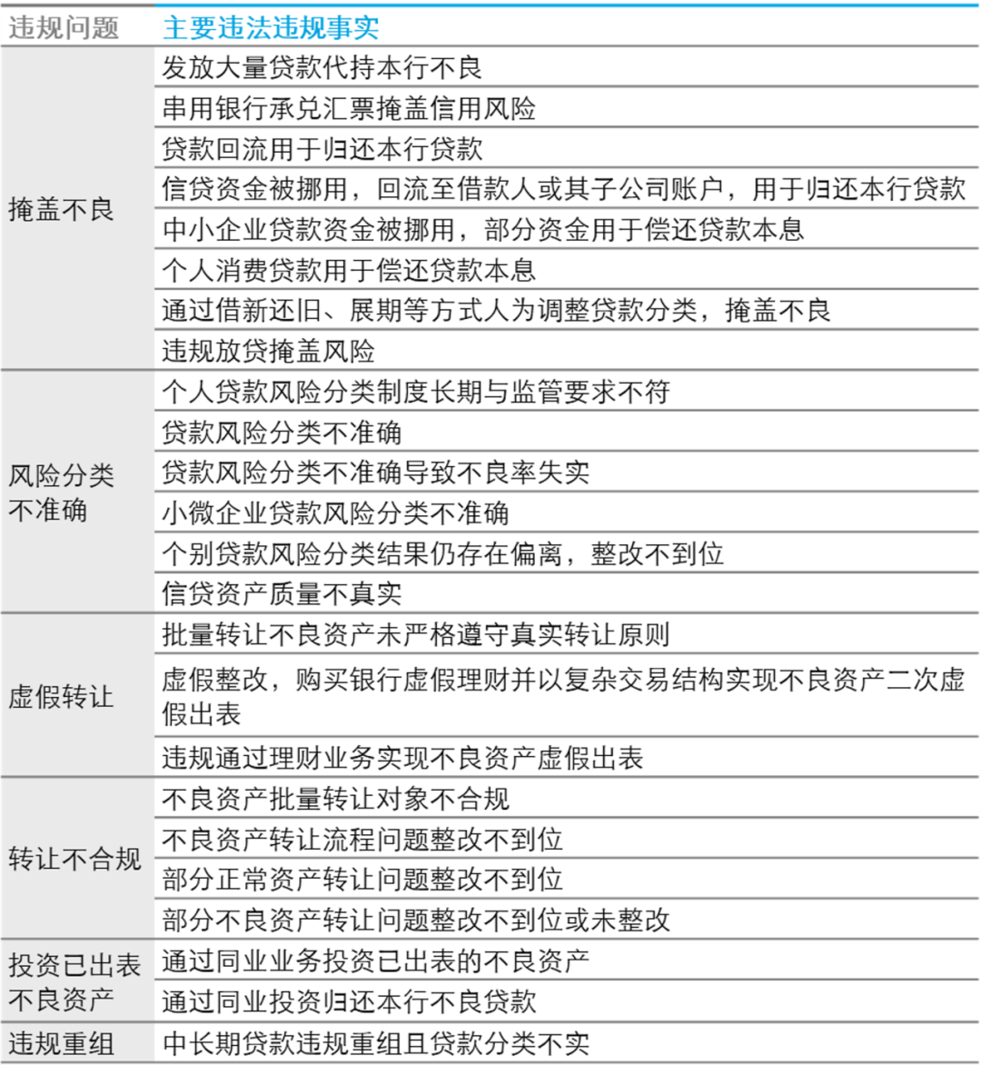 从出现频率来看,与不良资产相关的主要违法违规事实主要集中在掩盖不良、风险分类不准确、虚假转让、转让不合规、投资已出表不良资产以及违规重组等几方面。可以看出,金监总局在监督检查工作中狠抓落实几项最新出台的监管政策,十分重视银行机构信贷资产质量的真实性以及不良资产转让的合规性。