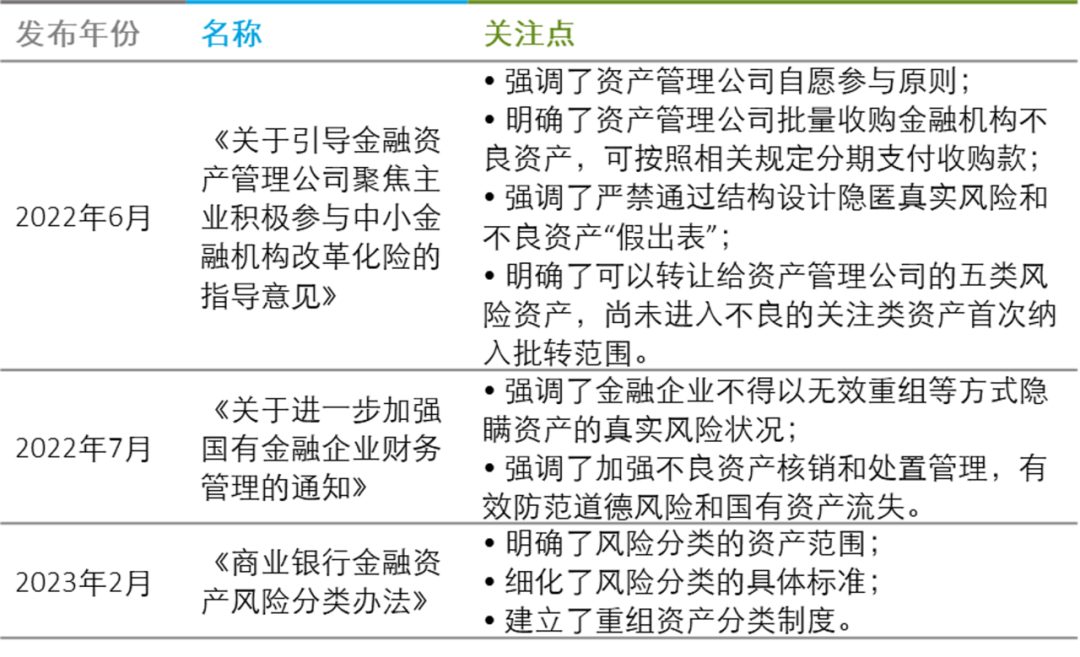 此次中央金融工作会议举行前,2022年以来,监管陆续发布了多项涉及不良资产处置政策,涵盖中小金融机构改革化险、国有金融企业财务管理、商业银行金融资产分类等领域,如《关于引导金融资产管理公司聚焦主业积极参与中小金融机构改革化险的指导意见》、《关于进一步加强国有金融企业财务管理的通知》、《商业银行金融资产风险分类办法》等,均对银行机构有重大影响。
