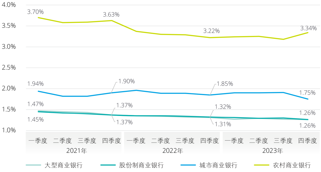 从银行类型来看,2023年农商行、城商行不良率显著高于大型商业银行及股份制商业银行。截至2023年末,大型商业银行不良贷款率为1.26%,同比下降0.05%;股份制商业银行不良贷款率为1.26%,同比下降0.06%;城市商业银行不良贷款率为1.75%,同比下降0.10%;而农村商业银行不良贷款率高达3.34%,同比上升0.12%。
