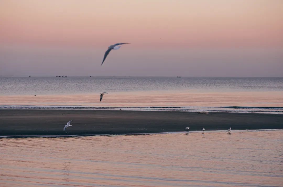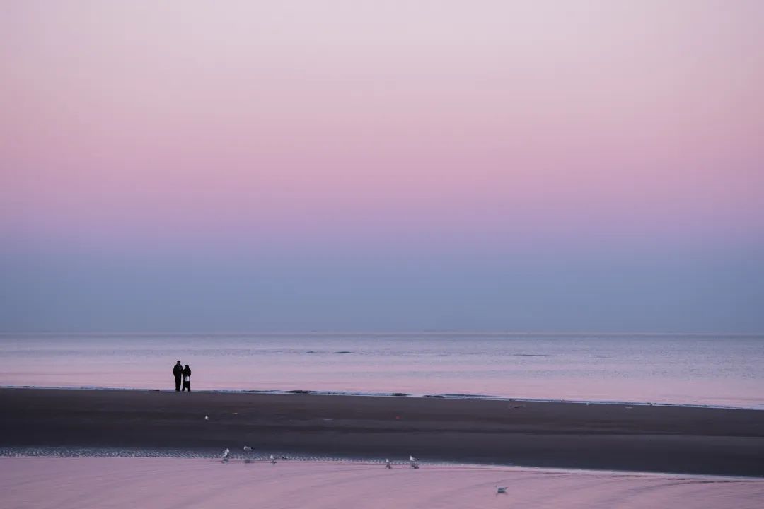 那时是和煦的初秋,海和天空从粉橙色向蓝过渡的日暮时分。