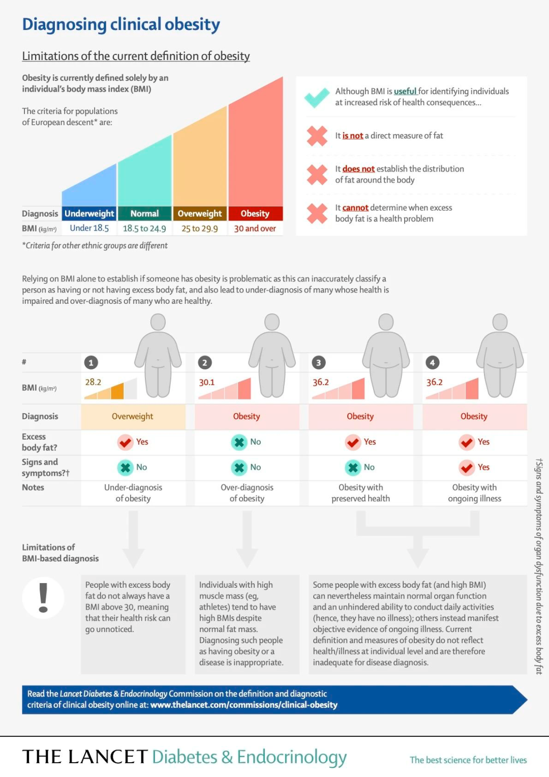 该报告得到了全球75个医疗组织的支持,其建议采用一种新的、更精细的诊断方法,即将体脂测量指标(如腰围、腰臀比、腰高比或直接测量体脂量)与体质指数(BMI)结合来诊断肥胖,从而降低误分类的风险。