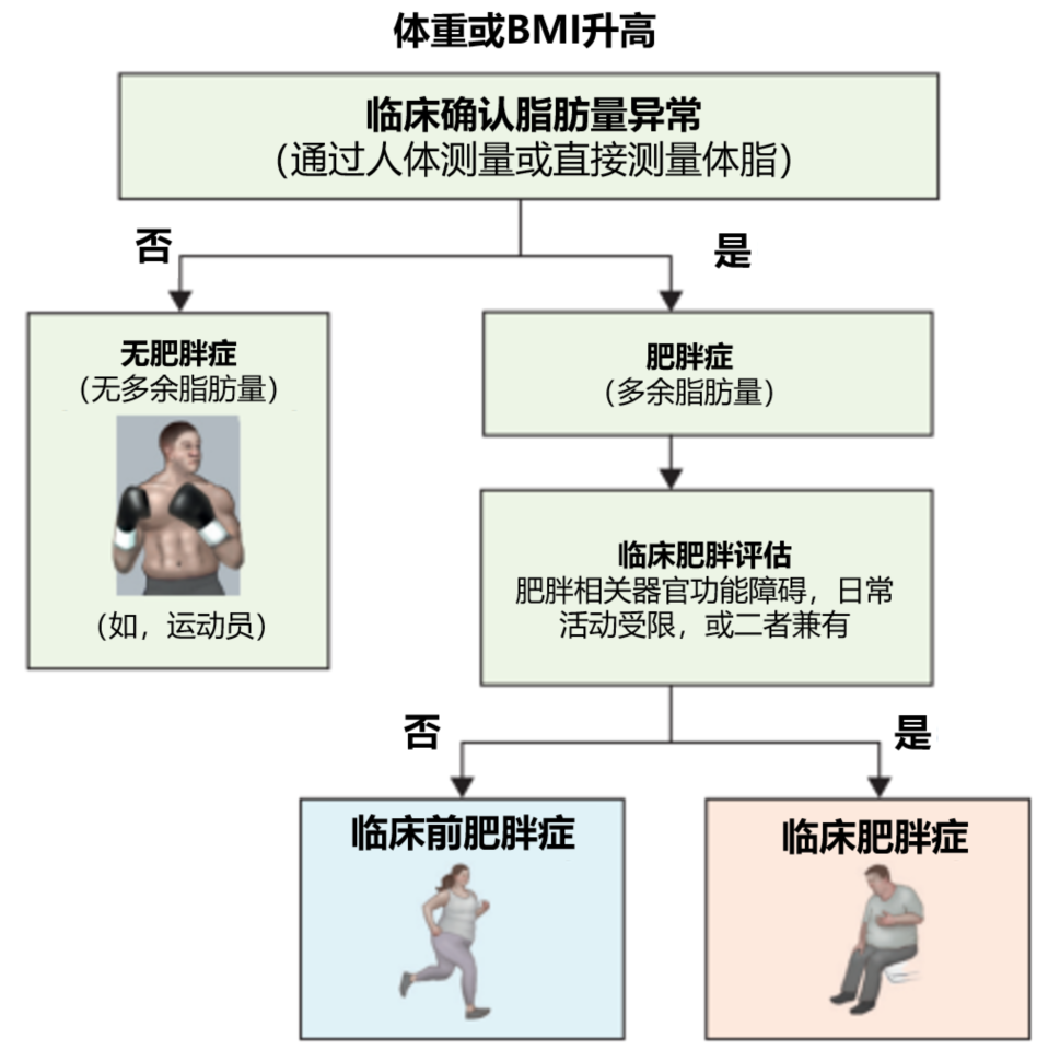 此外,报告依据客观的疾病指标,提出了两种新的肥胖诊断类别——“临床肥胖(clinical obesity)”与“亚临床肥胖(pre-clinical obesity,也称临床肥胖前期)”,前者代表着由肥胖导致的持续性器官功能障碍的慢性疾病;后者代表着与健康风险程度变化相关,但尚未出现持续性疾病的状况。