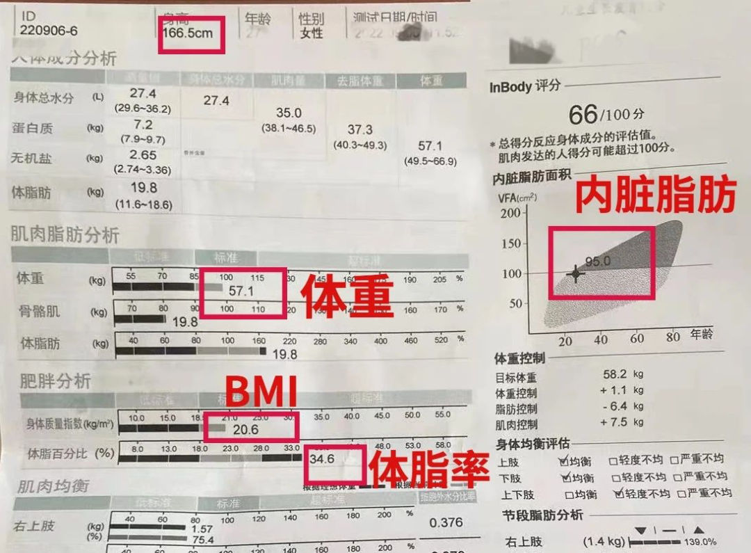我们来看例子,这是一位身高166.5cm,体重57.1kg的女性,她的BMI是20.6 ,属于正常范围,但体脂率高达 34.6%, 内脏脂肪95cm²,超出正常范围,一个典型的“瘦胖子”。