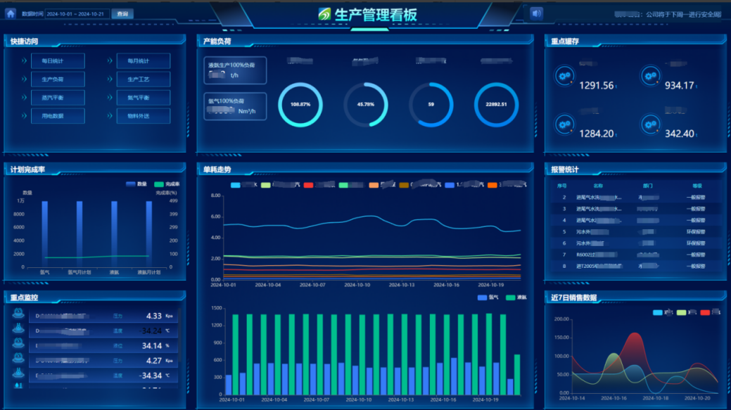 系统通过对生产过程的实时监控,提供全面的数据分析和决策支持,实现了生产流程的优化与高效运行。特别是在‘量(投入产出)、价(成本)、质(质量)、能(能源)、环(安全与环保)’五位一体的建设方针下,将复杂的数据结构进行可视化展示,为企业管理提供了精准的数据支撑。