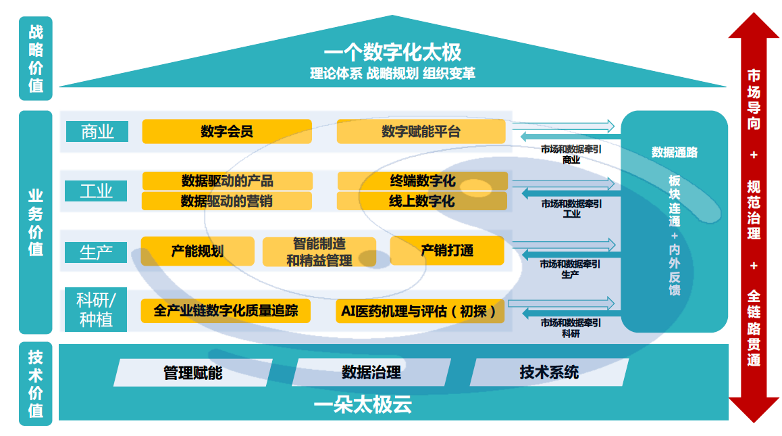在这样的整体规划下,结合已经明确的建设重点——“数据底座”和“数据平台”,形成“一个数字化太极”的数据通路,连通中药产业链各业务板块和关键环节,通过内外部反馈与市场需求联动,实现业务运营和管理全链路贯通,保障企业规范治理,从而形成“一个数字化太极”的正循环。