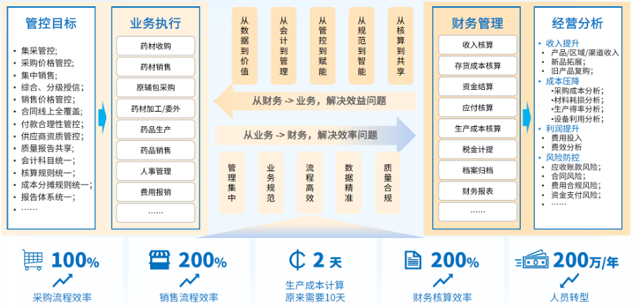 国药太极的不同业态采用同一个用友BIP平台,将种植、工业、商业,研发、采购、生产、销售、财务、人力等主要职能和领域纳入集成融合的一体化系统中,提升了集团整体运营的效率。
