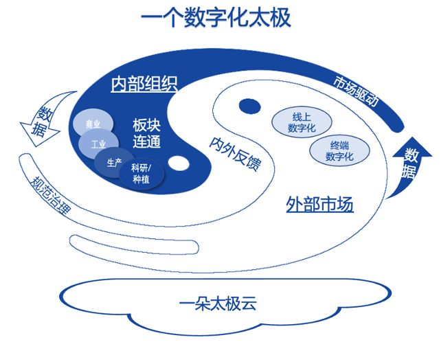 外部为阳,以市场需求为导向;内部为阴,以管理提升为目的,内外结合、阴阳互动,实现从业务到数据、从数据到业务的循环赋能,最终打通中药产业化、现代化和国际化“任督二脉”。因此,国药太极数字化转型不止于新技术推广应用,而是“长在业务上的数字化”,通过全产业链数字化转型升级,构建现代化产业体系和现代中药产业集群。