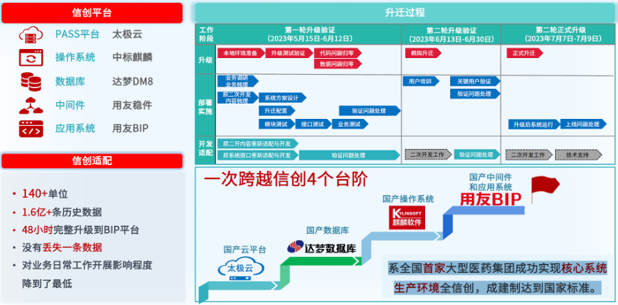 技术路线全栈国产化、全信创。国药太极的数字化体系建设以用友BIP为核心系统,成为全国⾸家⼤型医药集团成功实现核⼼系统、⽣产环境的全信创,成建制达到国家标准。