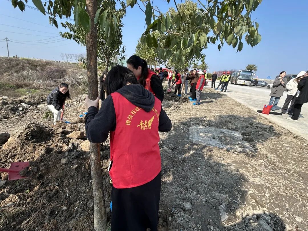 第一站橙色涟漪志愿队来到了由中共温州市龙湾区委组织部(人才办)与共青团温州市龙湾区委联合主办的“筑巢聚才逐青梦·同行共植共青林”活动,活动现场志愿者们默契配合,挥锹铲土、扶苗填坑,让一棵棵树苗在共青林里 “安家落户”,为大地增添了一抹新绿。