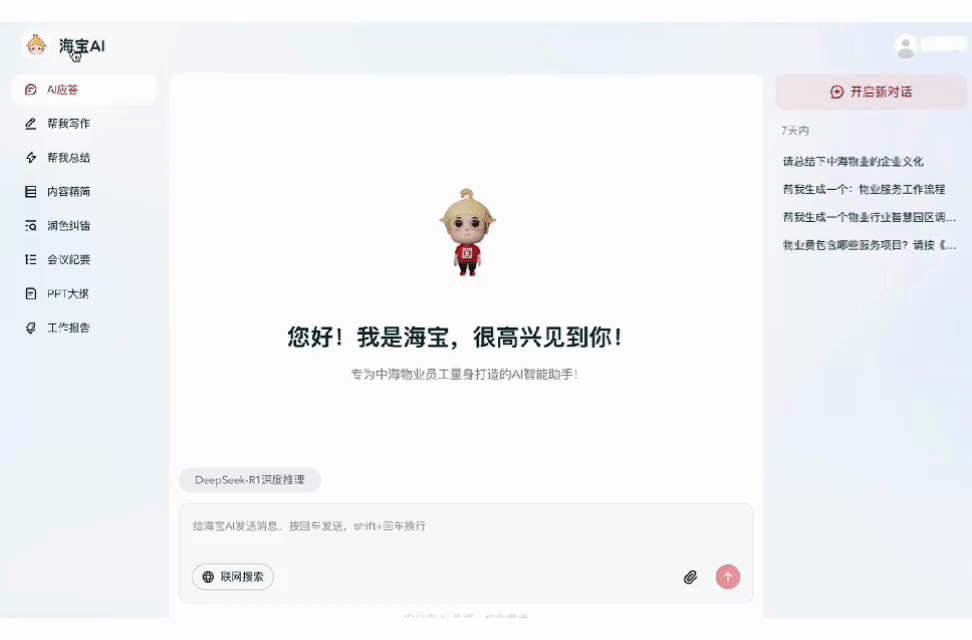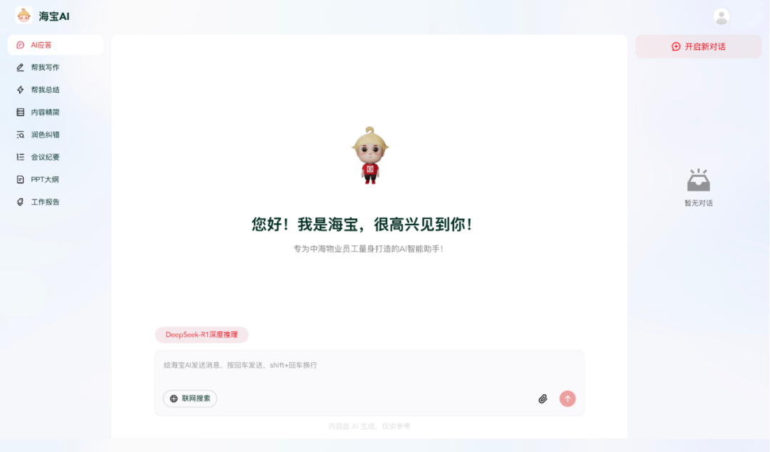 “海宝AI助手”通过多场景嵌入、多流程覆盖,将DeepSeek大模型能力深度融入业务场景,为一线人员提供高效的业务指引。中海物业员工可通过集团门户进入“海宝AI助手"智能交互界面,随时提出业务相关问题,获得对应的解决方案。同时,“AI赋能计划”系列培训正在有序开展,帮助员工掌握AI基础应用技能,充分运用AI辅助决策、分析解决问题,提升工作效率。