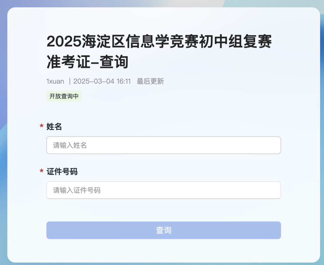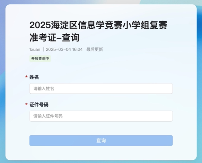 海淀区中小学信息学竞赛复赛准考证打印通道已开启!请报名的同学查看下方准考证查询链接,获悉竞赛具体安排。