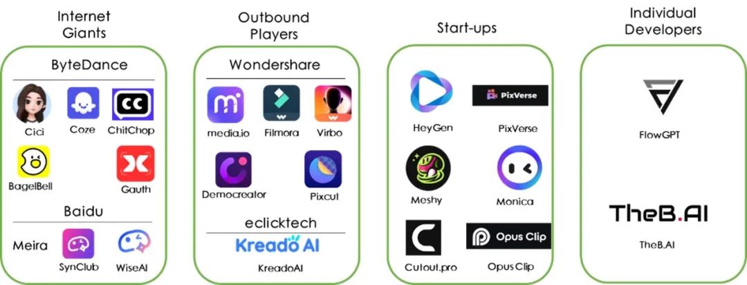 Currently, the AI products are undergoing rapid iteration in the application layer, and Southeast Asia and Africa are becoming the main overseas markets for Chinese players. Participants in China's AI application going global include internet giants (ByteDance, Baidu, etc.), seasoned outbound players (Wondershare, eclicktech), young start-ups and independent developers (Meshy, PixVerse). Some start-ups have even set up shops directly in the overseas markets (Heygen).