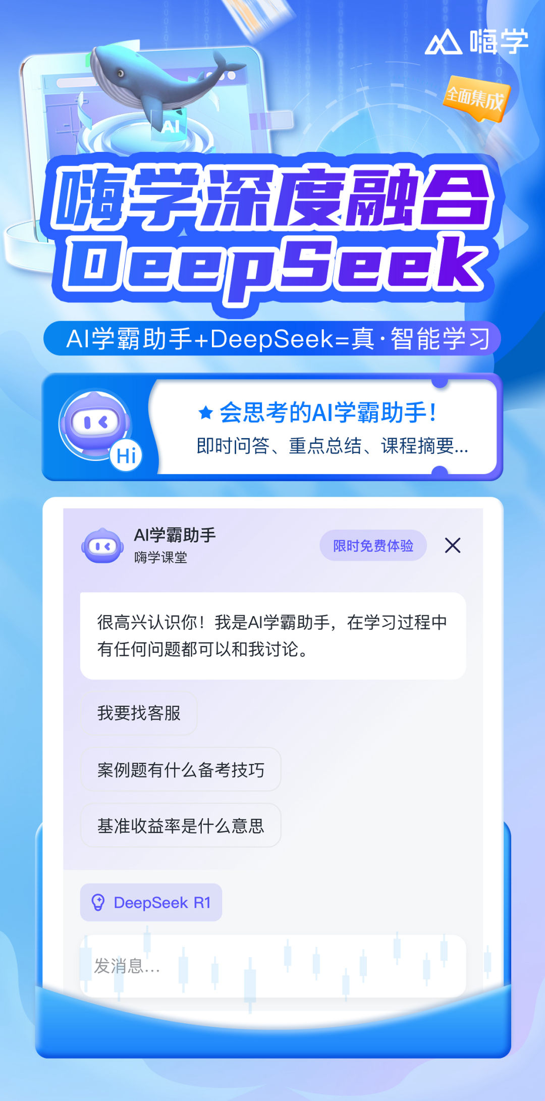 嗨学作为职业培训领域的领先平台,推出AI学霸助手,为学员提供更便捷的学习方式,近期AI学霸助手全面深度融合DeepSeek技术,接入AI学术问答,智能课程摘要,个性化学习定制等众多学习场景,为学员学习和考试带来了全方位的赋能!