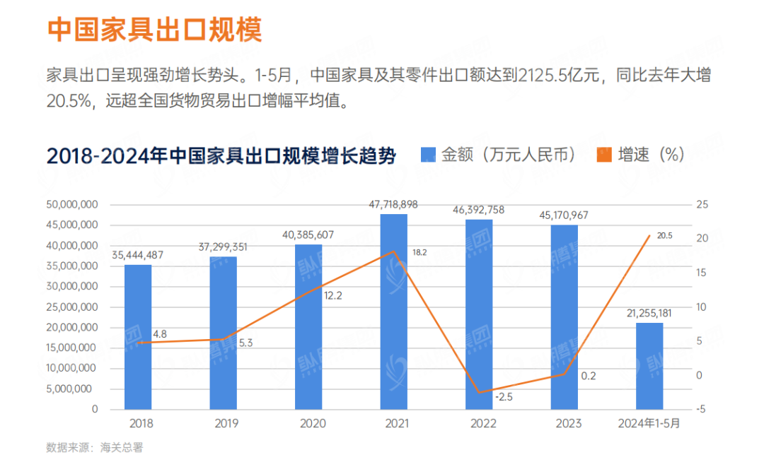 迈入2024年,家具出口似乎迎来了柳暗花明又逢春的一年。根据海关总署的数据,今年1月至5月,中国的家具出口额达到2125.5亿元人民币,同比增长20%。这一增长不仅是为了应对红海危机导致的海运费用上涨和关税政策的不确定性,而提前大规模备货的结果,也得益于海外市场去库存的进展,以及中国家具企业在产品设计、质量提升和品牌建设方面的持续努力。
