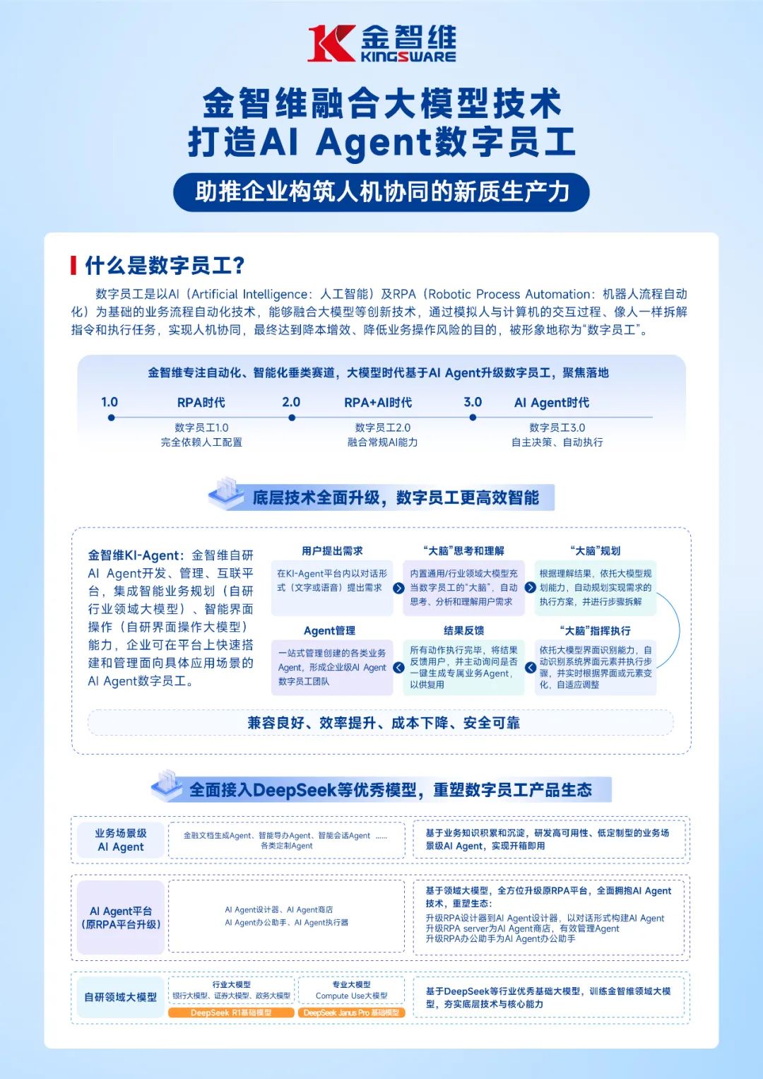 金智维是一家深耕企业级数字化转型解决方案的人工智能公司,目前已服务包括国有六大行总行在内的1500多家政企,提供基于AI Agent的数字员工解决方案,助力企业构筑人机协同的新质生产力。