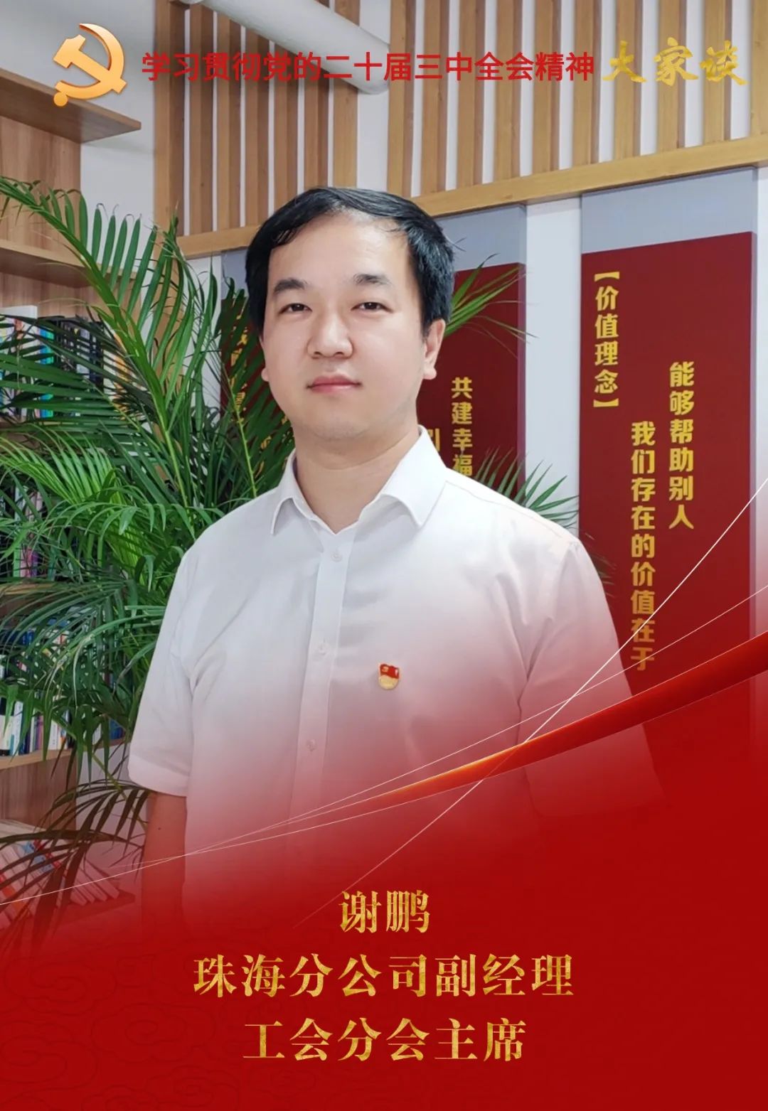 我将认真学习和领会党的二十届三中全会精神,助力做好珠海分公司的发展规划。一是做好人才梯队建设,进一步健全人才培训计划、员工激励措施、绩效考核制度等,鼓励员工积极创新、参与科研,同时加强与内部各部门、外部各单位的交流合作,争取将珠海分公司打造成人才培养和人才聚集的高地;二是积极参与粤港澳大湾区建设,充分发挥珠海分公司的地理优势,强化我院与澳门、横琴地区的政府和企业的合作。