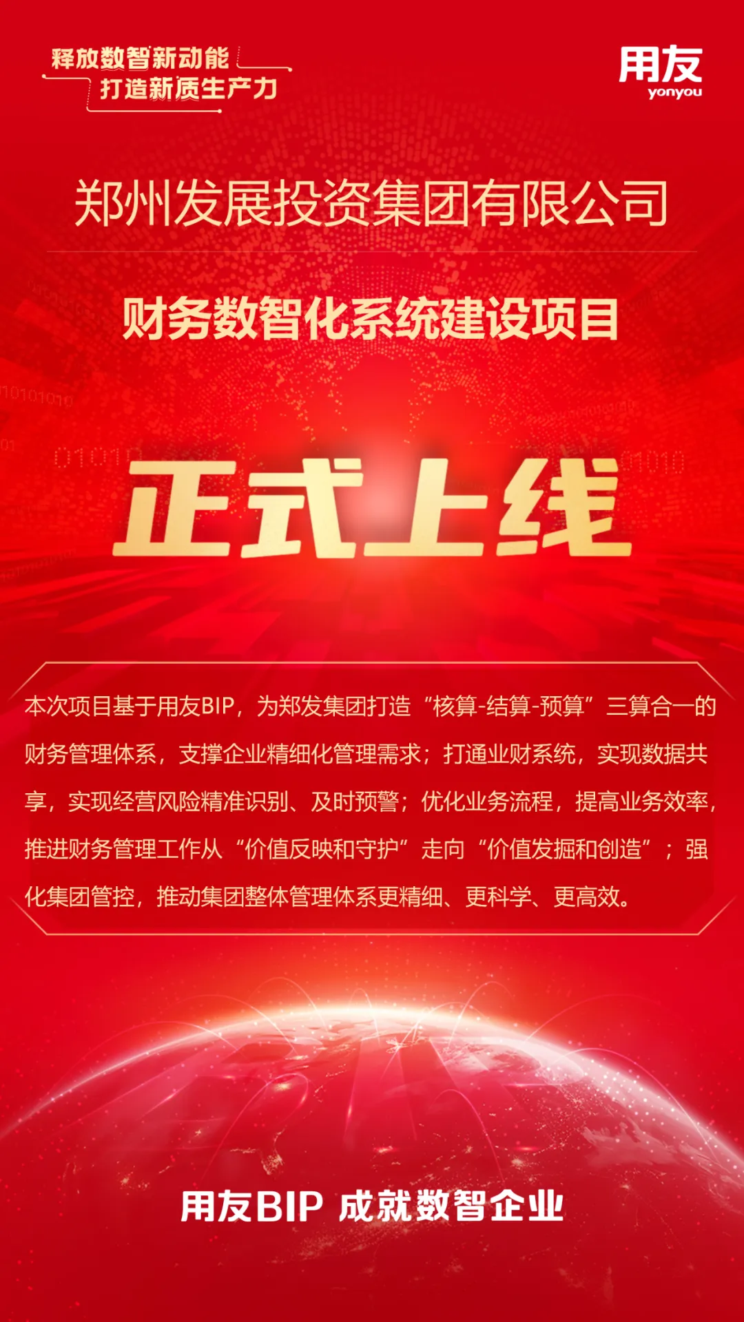 近日,由用友国资监管与投资控股行业事业部承建的郑州发展投资集团有限公司(简称:郑发集团)财务数智化升级项目成功上线!