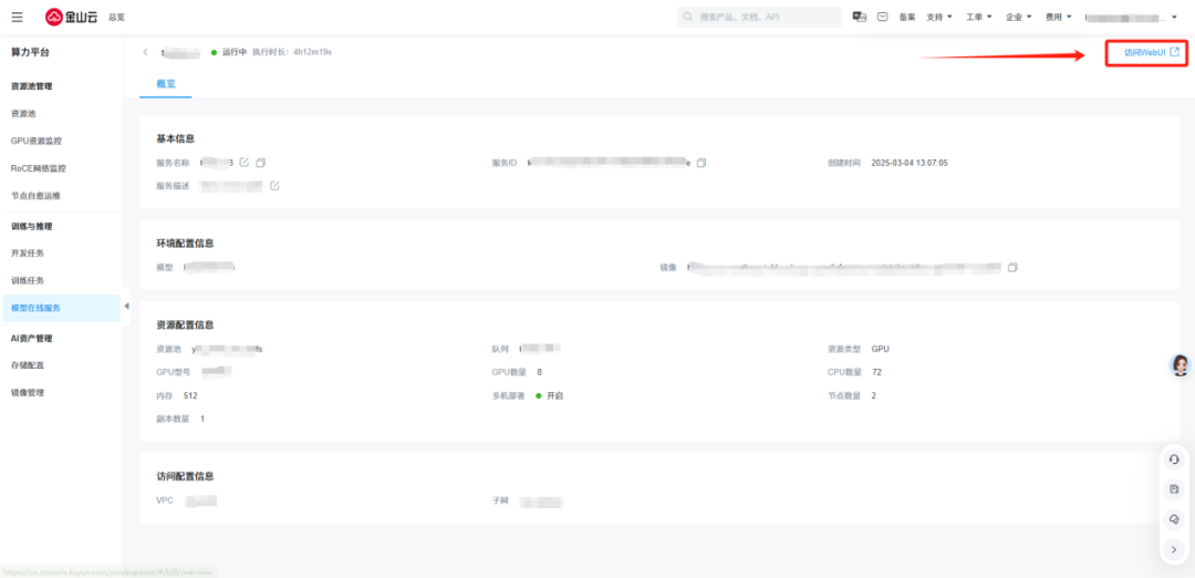 b.WebUI调用,模型部署成功后点击模型名称进入模型概览页,点击访问WebUI即可通过WebUI形式实现模型调用