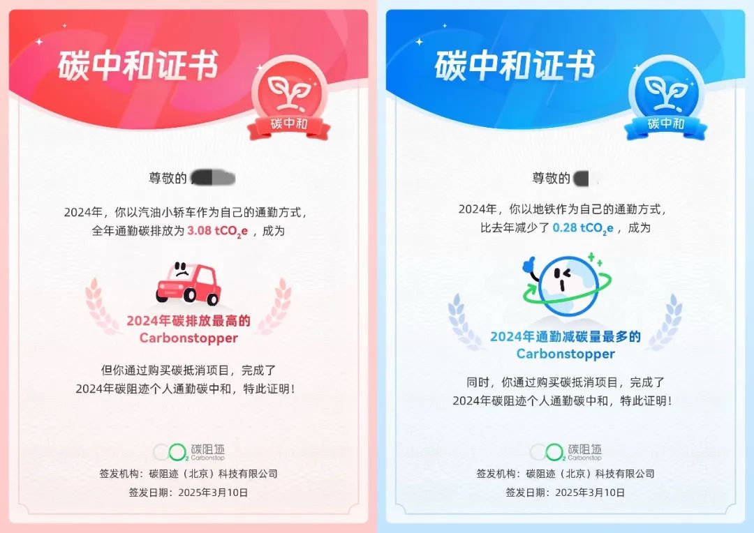 根据各位员工的通勤碳排放情况,我们为通勤碳排放量最高的员工颁发了红奖,为通勤碳减排最高的员工颁发了蓝奖,并从所有参与中和的 carbonstoppers 中随机抽取了 5 名减排幸运儿。这些荣誉不仅是对个人努力的认可,更是对全体员工绿色行动的鼓舞。