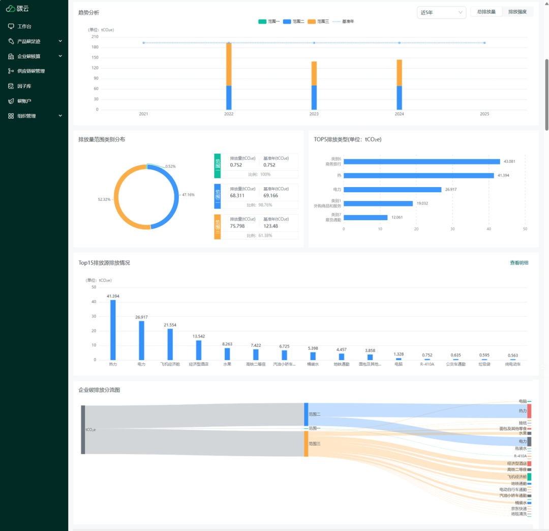 碳阻迹在2024年度沿用往年模型,在多个部门的配合下,再次利用碳云自主完成公司2024年度碳盘查,实现了对公司运营边界内(范围一、范围二及范围三)温室气体排放的精确量化。这不仅让我们对自身的碳排放有了更清晰的认识,更为后续的减排行动提供了精准的数据支持。