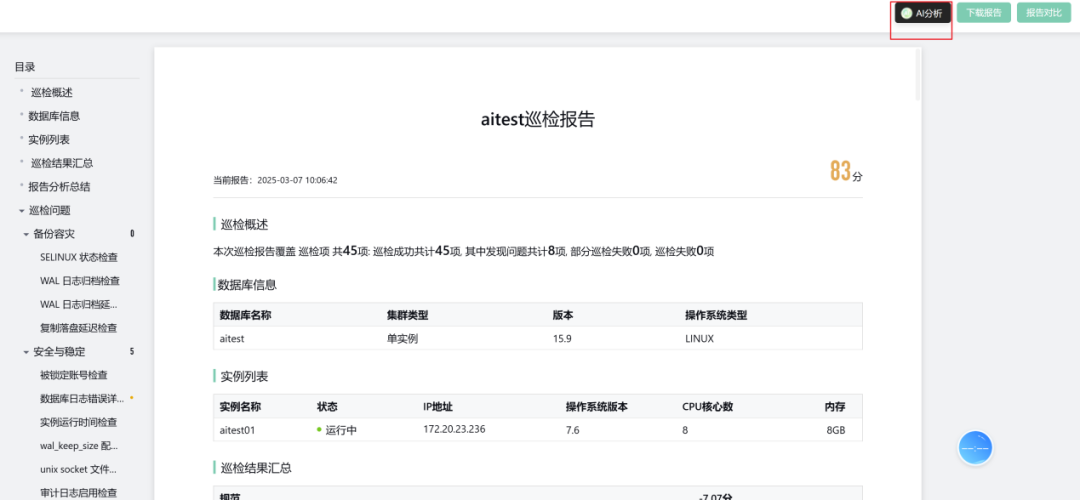 最新版本的多元数据库智能管理平台 zCloud 将集成 DeepSeek 大模型这件事想必大家都已经知道了。最近我在“疯狂”试用该新版本,不得不说,AI加持下的 zCloud 新特性让我这个算是比较资深的DBA眼里发光。DBA的日常工作里,数据库巡检报告的处理占据了我们不少时间和精力,而 zCloud 利用大模型对巡检报告进行智能分析的新特性可谓一缕福音,大幅提升了DBA对巡检报告的处理效率,解决了数据库运维领域的一大痛点。在细说 zCloud 的这一新特性之前,我想先和大家唠唠传统巡检报告的那些事儿。以往每次巡检结束后,系统会生成一份报告。报告里详细列出发现的问题,并会给出所谓的原因和修复建议。乍一看,似乎挺全面,可实际用起来就会困惑:“怎么都是‘千篇一律’的修复建议?”就拿“数据库日志发现严重错误”这个常见的巡检项问题来说,每次报告里的修复建议几乎都是“请通过错误日志排查问题”。但这个问题到底会产生什么影响?为什么会出现?具体又该如何解决?DBA真正关心的信息,报告里统统没有。就像下面这份日志截图,里面的确记录了一连串的错误信息,可它对我的帮助有限,无法提供有效的指引。每次拿到这样的报告后,我都很难直接依据报告解决问题,还得手动去分析具体原因,再凭借个人经验给出修复方案。要是只管理几套数据库,倒还勉强应付得来,可一旦面对几十套甚至几百套数据库,那工作量和压力瞬间“爆表”,不仅耗费大量时间,还特别容易出错,着实令人头疼。zCloud 这次带来的新特性,完全打破了传统巡检报告的局限,赋予了数据库巡检全新的体验。它借助大模型强大的语义处理和推理能力,针对每个巡检项的具体结果进行智能分析,不仅能精准找出问题的可能原因,还能给出明确的修复建议,甚至包含具体的检查方法和执行命令。还是以“数据库日志发现严重错误”为例,新特性会深入分析具体的错误日志,从影响、原因、修复建议三个维度进行详细说明(如下图所示),让我能够对这个问题形成全方位的认知。对于那些可直接通过命令操作解决的情况,zCloud 还会给出具体的操作方法,方便我直接进行验证或修复。让我们再通过一段操作录屏来直观体验一下该巡检项的AI分析。从截图和视频中我们可以清晰地看到,在问题“影响”部分,AI分析从稳定性、性能、高可用、安全等多个维度,对问题可能引发的风险进行了分类评估。这种全面的评估方式有助于DBA快速了解风险类别,为后续制定处理策略提供有益参考。比如,一旦发现性能方面存在风险,考虑到其可能对业务流畅性产生直接影响,我们通常会将其列为优先处理事项;而安全类风险,虽然也不容忽视,但在紧急程度上或许相对没那么高,可根据实际情况合理安排处理时间。再看“原因”和“修复建议”部分,其中有两点是我非常认可的:- 它给出的原因都是经过筛选、发生概率较高的。我推测是这个特性具备输出多个可能性最大原因的能力,以便让我们能快速锁定问题的关键所在,避免在一些低概率因素上浪费时间。