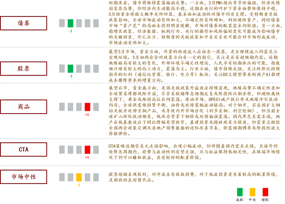 短期来看,债市将维持震荡偏弱走势。一方面,2月PMI超出季节性偏强,经济延续弱复苏态势,但经济内生动能尚不稳,近期在央行的呵护下资金面整体保持平稳,3月份资金价格大概率有所回落,基本面和流动性对债市仍有支撑。受特朗普关税政策影响,全球市场波动有所加大,不确定性有所增加,利好避险资产,同时债券市场“资产荒”的局面未得到明显缓解,市场对债券的配置需求仍较强。另一方面,稳增长政策、经济数据、机构行为、央行的操作和风险偏好变化可能成为影响债市的关键因素,外汇压力、特朗普的关税政策和中美关系也可能会对市场形成扰动,市场波动有所加大。