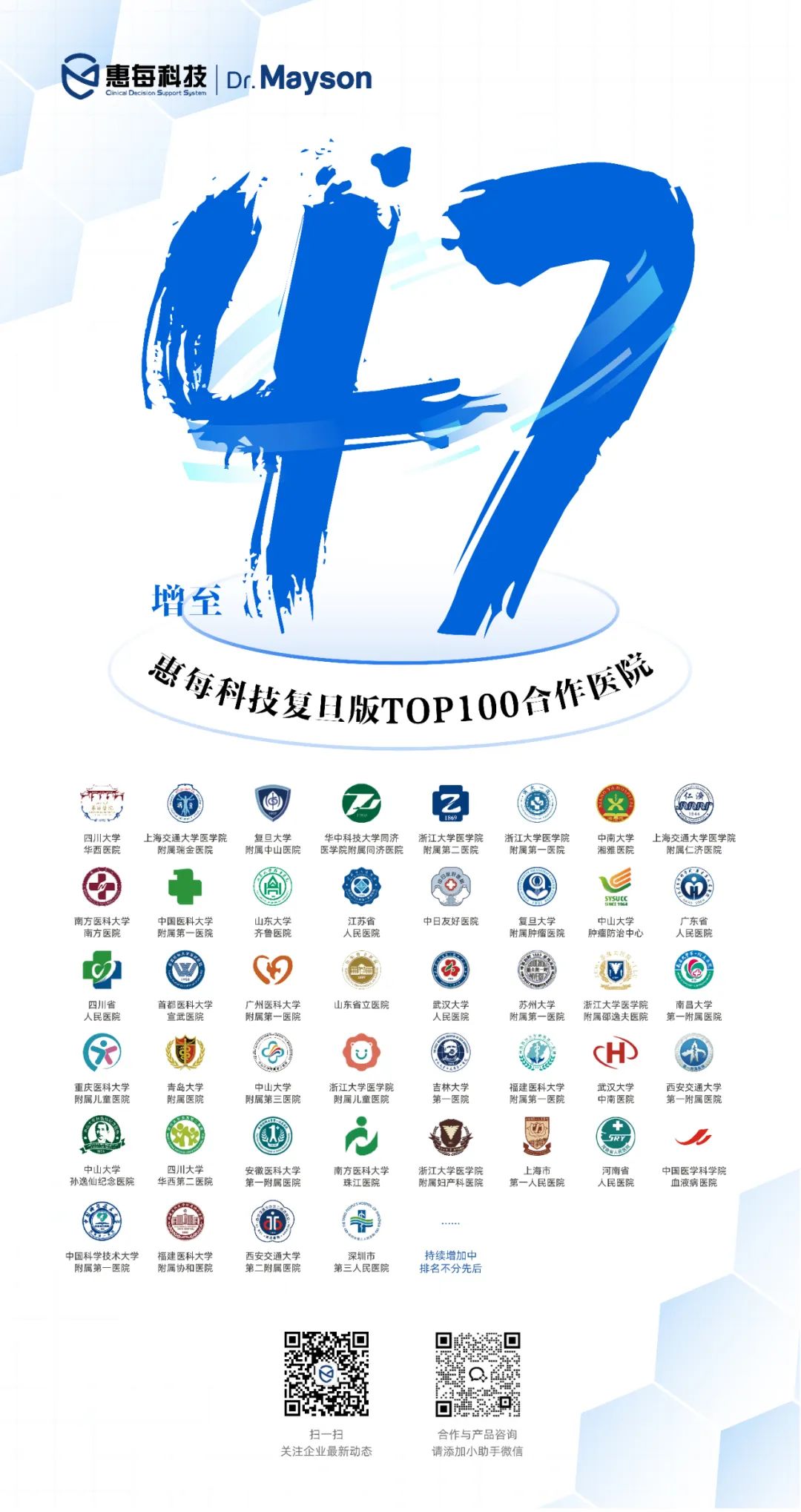 惠每医疗人工智能解决方案(Dr. Mayson)以数据中台为底座,创新大模型技术应用,集成循证医学知识库,通过CDSS 3.0技术与智能化诊疗路径,实时分析病历数据与内涵质量,在临床诊疗决策、单病种管理、DRG/DIP控费等环节形成质控闭环,实现诊疗规范化与费用合理化两大管理目标。产品线覆盖肿瘤、心血管等十余个专科及国家重点监测单病种,有效提升医疗质量、提高医务管理效率,支撑各项评审考核,赋能医院高质量发展。基于CDSS技术优势和数据能力,惠每临床科研平台(Darwin)助力医院提升GCP项目执行效率,管理诊疗规范。