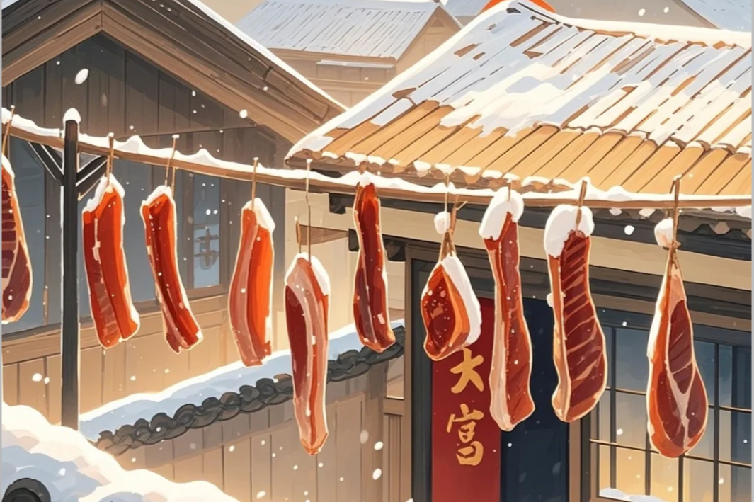 腌肉、打雪仗、赏雪景、进补都是大雪节气的民俗。老南京有句俗话,叫做“小雪腌菜,大雪腌肉”。此时,家家户户门口,窗台上都会挂上腌肉、香肠、咸鱼等腌制品,形成一道亮丽的风景。