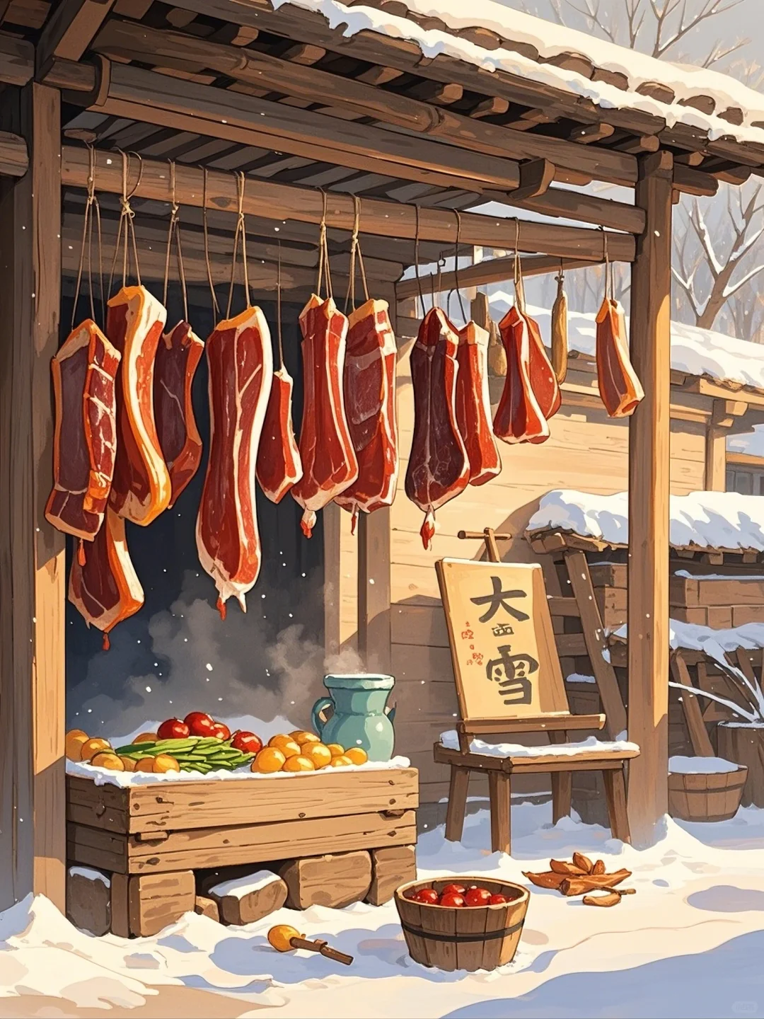 民间有:“冬腊风腌,蓄以御冬”的习俗。大雪节气一到,家家户户忙着腌制“咸货”。