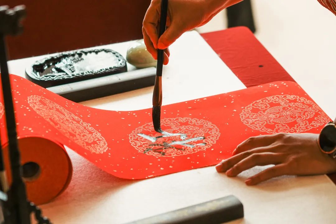 挥笔纳福区,墨香四溢,人们挥毫泼墨,书写春联与福字,寄托美好愿景。