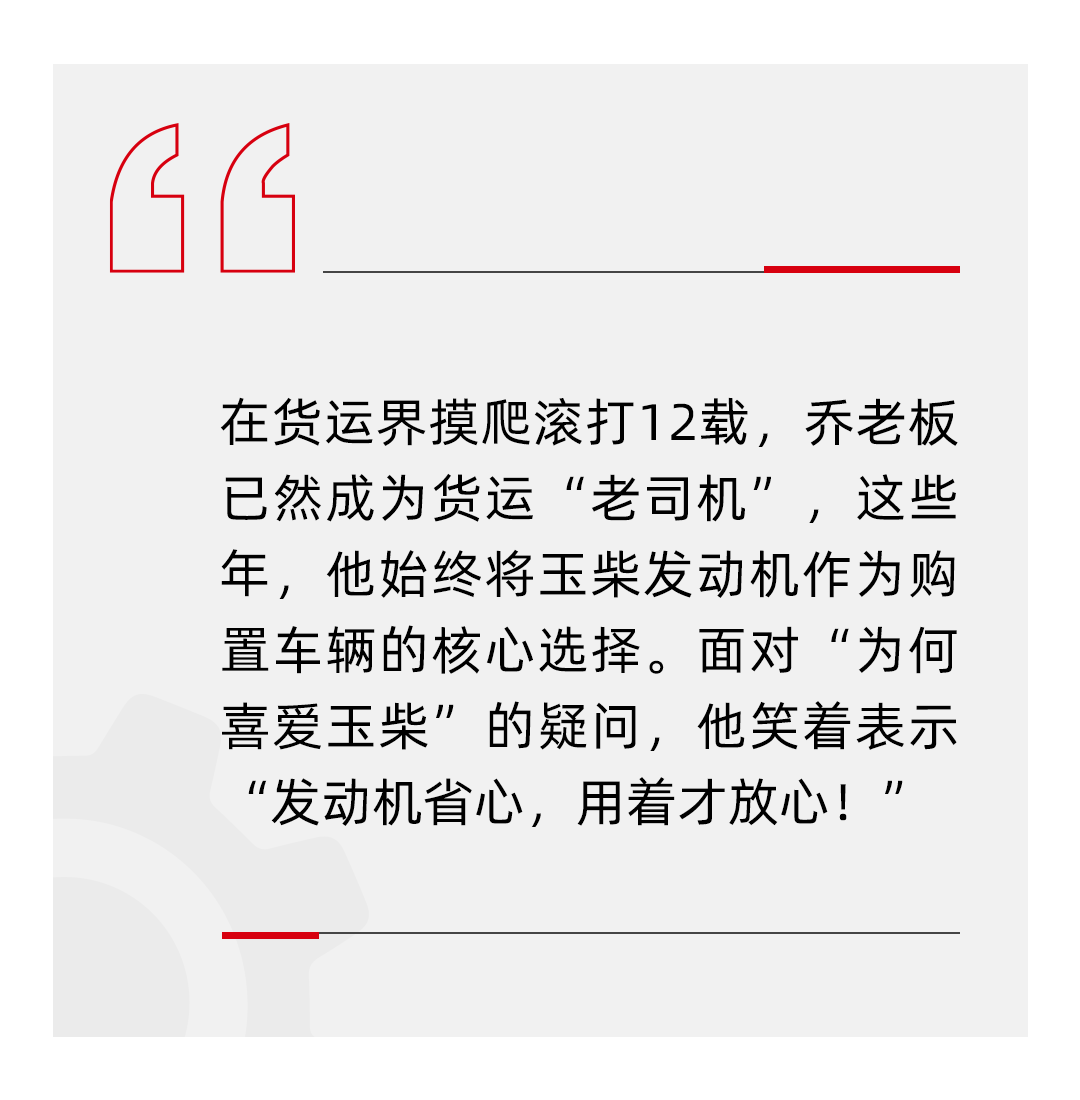 在此之前,乔老板驾驶过搭载玉柴440马力发动机的燃气车,这台车陪伴他征战货运一线近6年,累计行驶130万公里却从未大修,仅需定期更换机油和基础保养。“核心部件根本没动过,连半路抛锚都没发生过”,在乔老板看来,玉柴的稳定性和耐用性直接降低了运营成本,维护成本少,也没有那么多小毛病,省下的都是真金白银。